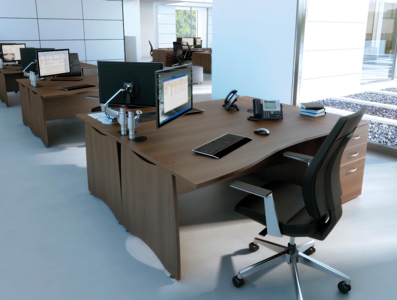 A modern panel-ended desk range offering traditional stylish looks. A cost effective mid range product includes cable post to support a 3rd level of accessories – 10 year guarantee, made in the UK. Available in a variety of colour finishes and shapes. Comes in Dark Walnut finish Bow front ‘Kidney shape’ desk 1800 x 800mm