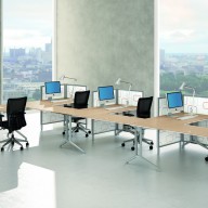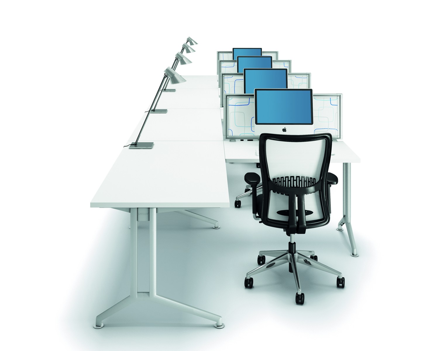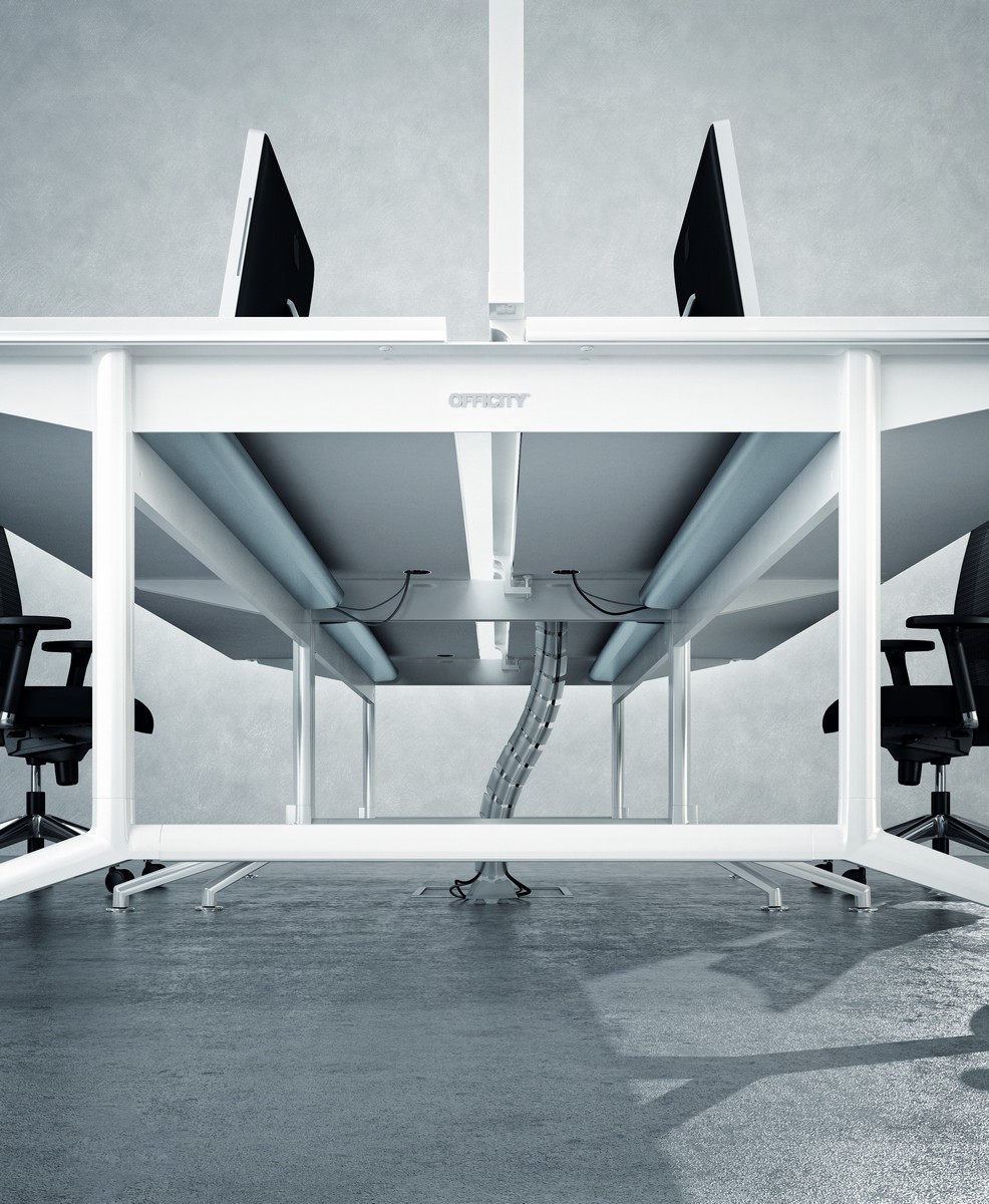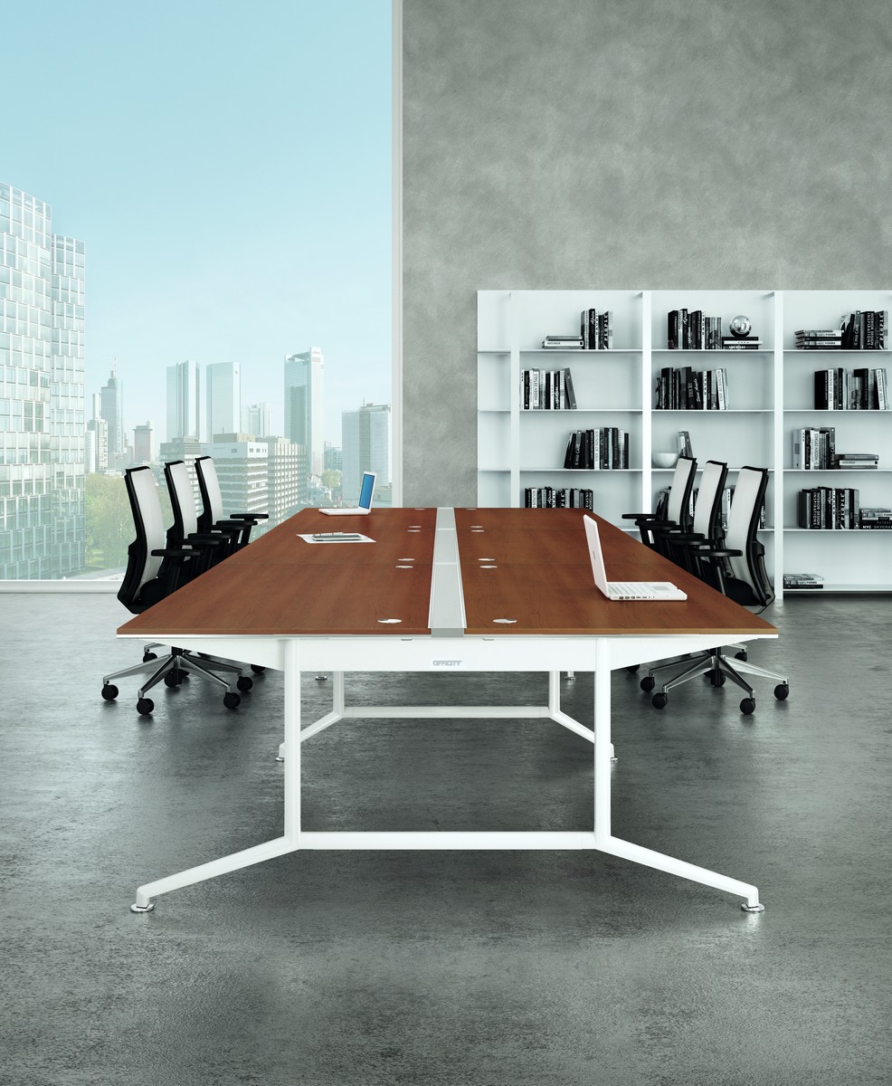 The X2 office desk develops itself around a structure with endless connections and components. A flexible line with different solutions. The structural details of the leg and its modularity create a new concept of operative space. Different types of screens, light and simple, divide the various working areas with discretion.